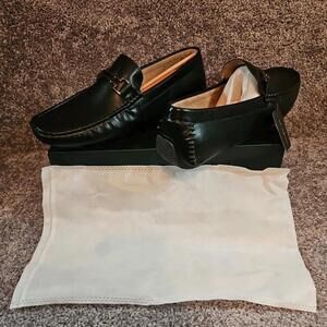 The soft black slip on Penny loafers have metal accents and are easy to clean. Have a non slip bottom, breathable lining, cushioned latex insole. Comes with dust covers. This brand tends to run narrow.