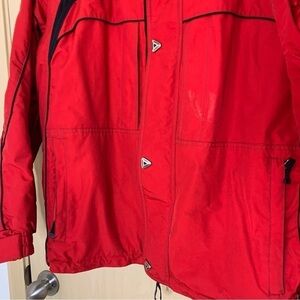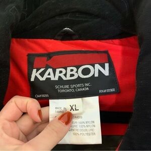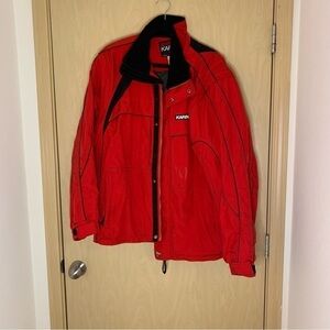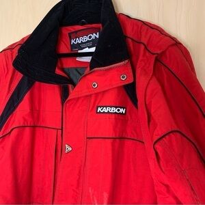 Men;s Karbon red colored ski/ snowboard jacket with zip off sleeves. Used condition. A few stains. No hood. Overall good working condition. Size extra large