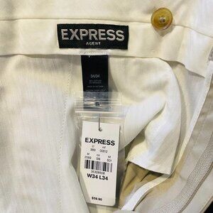 New with tags, Express Agent men's khaki dress pants in beige, size 34. Comfortable relaxed fit, perfect for work or business settings. Made from durable cotton.