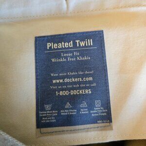 Khaki twill dress pants by DOCKERS. Pleated front, 4 pockets, cuffed, loose fit, wrinkle free. Size 44 x 32. Very good pre-owned condition.