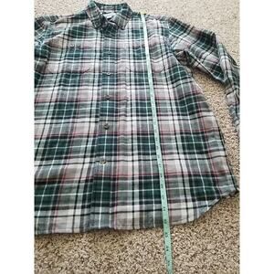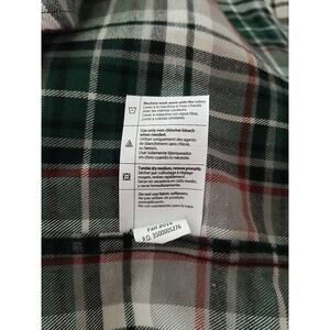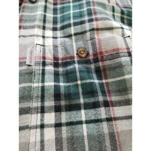 This Men's Carhartt Plaid Button-Up Flannel Shirt is ideal for both casual and workwear occasions. With its long sleeves and collared neckline, it offers a relaxed fit for comfort. The shirt is made of cotton flannel fabric, has a button-down collar, and features a plaid pattern in green, gray, and red and dark blue.