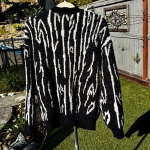Men’s L Fuzzy Knit Cardigan Black White Abstract Pattern Button Front Grandpa