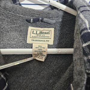 Details: Embrace warmth and style with this LL Bean Insulated Button-Front in a sophisticated gray and navy plaid. The chest pockets and hip pockets add a touch of functionality to this classic piece. Crafted with a 100% cotton shell and a cozy 100% polyester fleece lining, it's designed to keep you comfortable in chilly weather. Meticulously maintained, this jacket is free from any stains, ensuring a polished look. Elevate your winter wardrobe with this LL Bean gem that seamlessly combines timeless plaid, durability, and cozy insulation for a versatile and stylish choice.