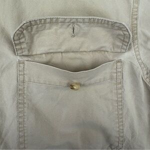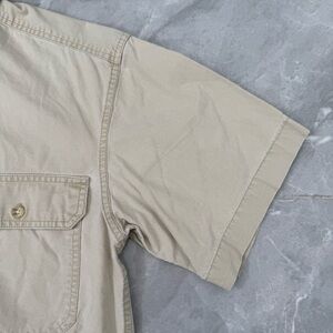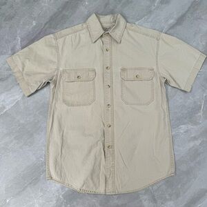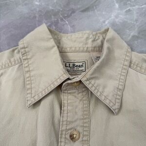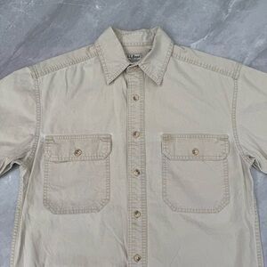 Good condition - Men’s L.L. Bean Sunwashed Canvas Short Sleeve Button Down Cotton Shirt. Has two button closure chest pockets. Tiny stain under right pocket (as pictured), but hard to see. 100% cotton. Color: light tan/khaki. Size: S Regular.