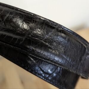 Heavy leather embossed with a faux crocodile pattern.