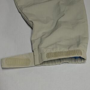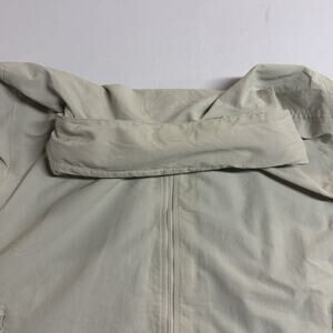 The Men's Lands' End Hooded Cream-Colored Full Zip Windbreaker in size Large is a versatile and stylish outerwear option for men. Made with nylon outer shell material and polyester lining, this lightweight jacket is perfect for various occasions including casual, workwear, and business. This is a hooded jacket. Hood can be tucked into collar and is cover by Velcro closure. Iner mesh lining makes the jacket breathable. Outer zipper pockets. Sleeves have velcro adjustable closure. No stain or rips.