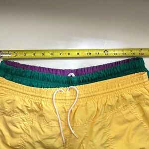 Set of two lightweight men's swim/active wear shorts. Both have elastic waist with drawstring for adjustment. Front pockets on both, the green pair have a back pocket with zipper closure. Marked size XL (40-42). Material is 100% nylon, made in USA. In good condition.