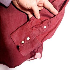 Incredibly well made cotton blend is heavyweight and durable. True pearl snap buttons in a western style and cut. Excellent condition with virtually no signs of wear. The color is a deep crimson that flashes with a silver undertone in certain lighting (hard to catch in a photo unfortunately).