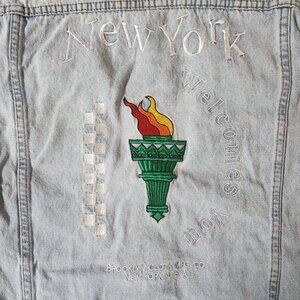 This denim jacket from Brooklyn Cloth has a cool vintage-y look. It is embellished with patches on the front and the arms along with embroidery on the back. Most of the designs are New York-themed. The material is 90/10 cotton/spandex blend. The jacket is in good condition with some fading; it is free of visible stains.