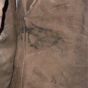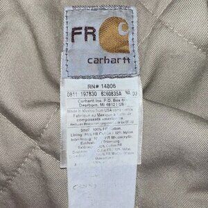 The Mens Large Carhartt FR Insulated Bomber Jacket in brown is a rugged and functional outerwear piece perfect for casual or workwear occasions. Made from a durable cotton-nylon blend with fiberfill insulation, this jacket offers both warmth and protection. The distressed tan color with quilted accents adds a stylish touch to the bomber style design, while the zip closure and regular fit make it comfortable and practical for everyday wear. Ideal for those in need of a high-performance jacket for construction or outdoor activities, this Carhartt FR model is a reliable choice for the modern man.