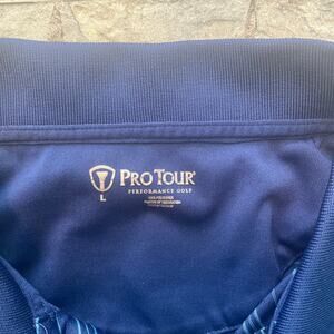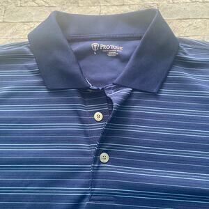 Men’s Large Pro Tour Polo shirt. Navy Blue & light blue striped Performance golf polo in good preowned condition. Smoke free home.