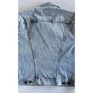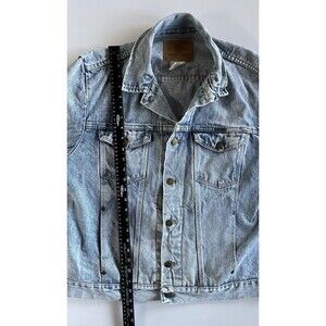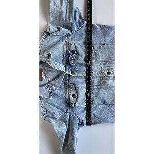 Light wash vintage Wrangler trucker jacket in good condition. Features two button chest pockets, hand pockets, large interior pockets, and adjustable waist. No significant damage or staining. Some small areas of faded yellowing which may be part of fabric. No missing rivets or buttons. See measurements in pictures.