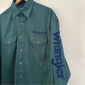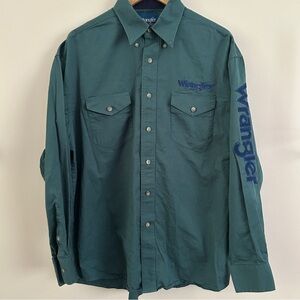 Teal button-up with classic Wrangler style. Features durable fabric and signature logo.