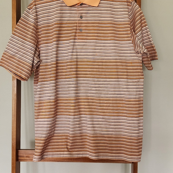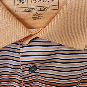 large golf shirt, Ledbetter from Jos. A. Bank peach in color with stripes of white, peach light ,peach dark and blue.