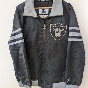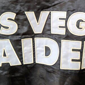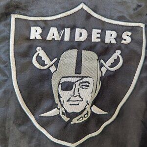 Show your Las Vegas Raiders spirit with this previously owned Starter Full-Snap Varsity Jacket. This classic varsity jacket features bold team colors and iconic Las Vegas Raiders logos, making it a stylish way to show your team spirit. With its comfortable fit and moderate weight, it's the perfect choice for cheering on the team from the sidelines or adding a touch of team pride to your everyday look. There is some wear on the embroidery. See the pictures for details.
