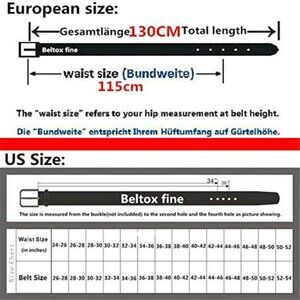 Size: please buy one size larger than your waist size if you want to be flexible. Size 28 30 32 34 36 38 40 42 44 46 48 50 52 54 56 are all available. Men’s plus size belt and even more bigger and taller men will find their fits. If it is too large for you, it is easy to cut the belt to fit.