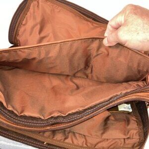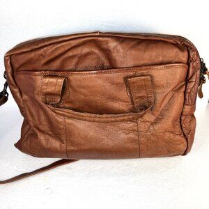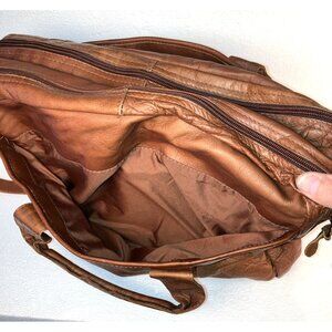 This is a men's leather crossbody bag in brown color. It has a zipped closure and a metal handle/strap material. The bag is handmade and has a vintage style. It is a medium size, measuring 17" in width, 11" in height, and 5" in depth. The lining material is polyester. The bag is suitable for casual occasions and has an adjustable strap. It is designed to carry your personal items such as a Laptop, books or notebooks with storage for a calculator and pens.