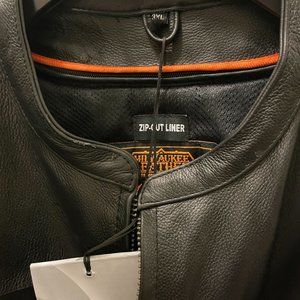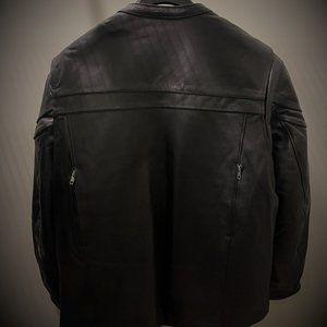 This leather jacket has a full sleeve zip out thermal liner. There are minor scratches in the leather around the neck, please see 3rd photo for example. This is only available in size 3XL.Please be sure of fit before buying or sending an offer. Returns will not be accepted.