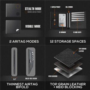 -Stealth Wallet with 2 Modes for AirTag: Classic bifold design distinguished by 2 inner pockets for AirTag with different uses: Stealth mode holds AirTag in hidden compartment accessible through secret channel under ID window & Space-saving mode sets AirTag in round tight window for unparalleled thinness; both holders provide peace of mind with strong, flat snaps that lock AirTag into place & prevent it from falling out