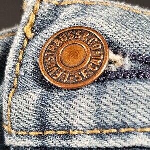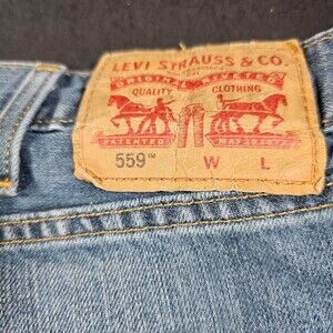 Men's Levi 559 blue jeans, 44 W, 30 L. Relaxed straight fit medium wash, slightly distressed. Some slight wear on hem at bottom of legs. In good preowned condition, no other defects noted.