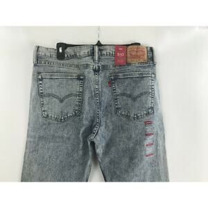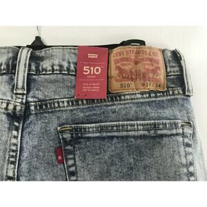 You are purchasing a nice pair of Levis 510 faded skinny fit blue jeans. These jeans are size 34 x 34, as stated on the interior tag, however by hand measurements they are 34 x 33. The jeans sit at the waist and are skinny from hip to ankle. They are a stretch fit and are 98% cotton and 2% elastane. The jeans have a rip at each knee and are new with tags retailing for $69.50