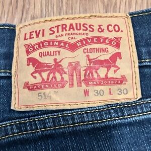 Stylish Levi's 514 (straight fit) jeans in dark blue. Features signature stitching and classic logo patch. Like new. Size 30x30.