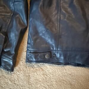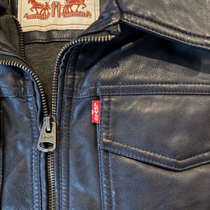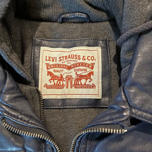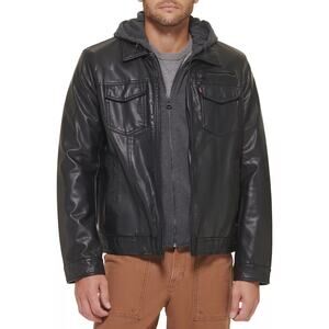Mens Levis Black Faux Leather Jean Jacket Lined Zip Up Hooded Size Large $140