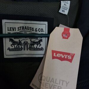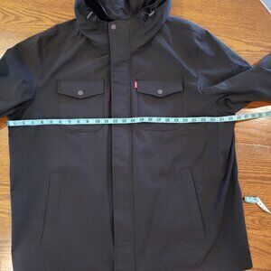 Men's Levi's Black Rain Jacket with hood- XL, New with Tag, has four front pockets 2 at the chest and 2 slash pockets, has a zip and button closure. Approx measurements in photo's , Nice Jacket!