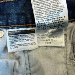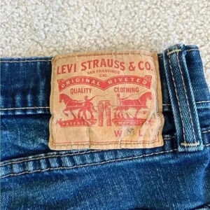 Men’s Levi’s blue jeans in size 30 x 30. These are a slim straight style. In good to fair condition with minor staining on the front and back and denim wear on the back.