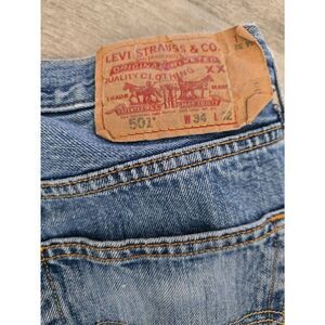 Men's Levi's 501 Original Fit Jeans. Minor destruction and paint splatters. Button fly. Size 34 x 32. Please review all photos.