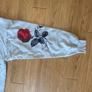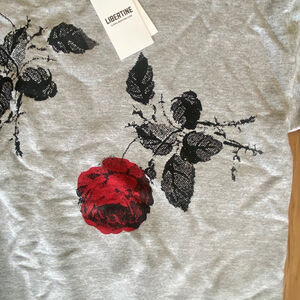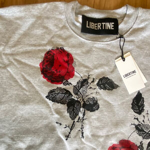 This is a new Libertine sweatshirt with original tags and packaging. The garment is light gray and features a red rose and black leaves design on the front and sleeves. The sweatshirt has a crew neck and long sleeves with ribbed cuffs and hem. The material appears to be a soft cotton blend.