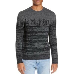 Men's crewneck pullover sweater with a black and grey mountain scene by Life/After/Denim (this is a Nordstrom brand). Feels SUPER high quality and made with a lambswool blend. Soft, not itchy!
