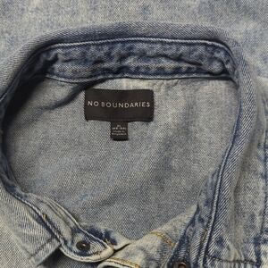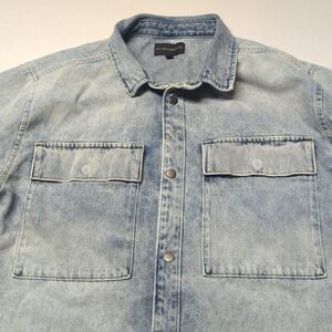 Elevate your casual style with this light blue denim shirt jacket. Perfect for layering, it features a classic button-up design and chest pockets for added functionality. Jacket has one small hole in the right sleeve see pics.