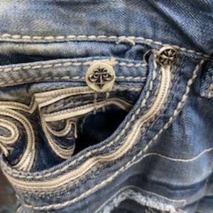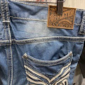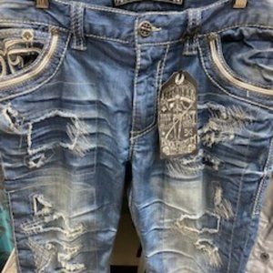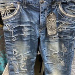 Men's Light Blue Distressed Affliction Jeans "Ace" Style. Nice Details on front and back pockets. Brand new with all tags, great condition. size 33