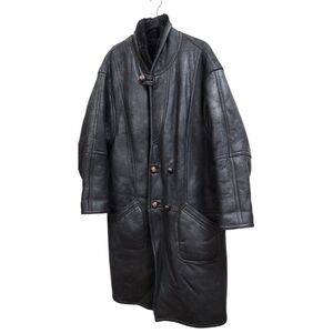 Men's Long Black Leather Shearling Coat Vintage Double-Breasted Winter Jacket L
