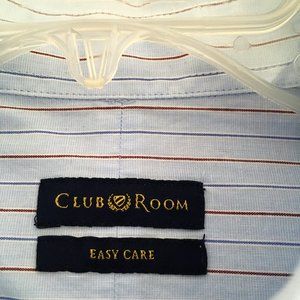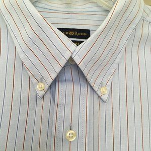 Long sleeve men's dress shirt. Pale blue with red and dark blue verticle stripes.