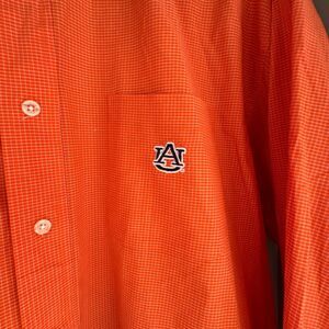 Show your Auburn Tigers pride with this authentic Crable Sportswear men’s long sleeve button-up shirt. Crafted from 100% cotton, this collared button-down features an orange and white check pattern with the official Auburn University embroidered logo on the chest. Perfect for game day, tailgating, casual wear, or even office spirit days, this shirt combines durability, comfort, and timeless collegiate style.