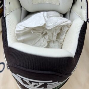 Absolutely new, never worn,, signature, monogrammed calf leather, fits size 12 US. Sold out worldwide.