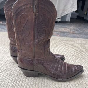These Lucchese Classics boots are a must-have for any cowboy or western enthusiast. With a pointed toe and pull-on closure, they are both stylish and easy to wear. The brown Caiman upper material is complemented by a leather lining and outsole, making them durable and comfortable for any occasion.
