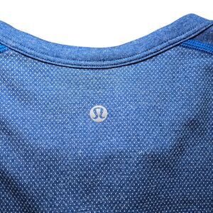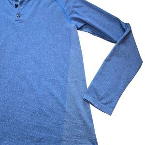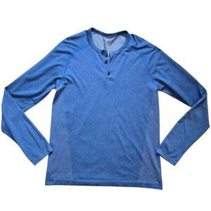 Men's Lululemon Metal Vent Tech Long Sleeve Henley in Blue, size medium. Seamless construction, anti-stink technology, and strategic venting make this long-sleeve henley training session ready. Lightweight fabric is sweat-wicking and four-way stretch.