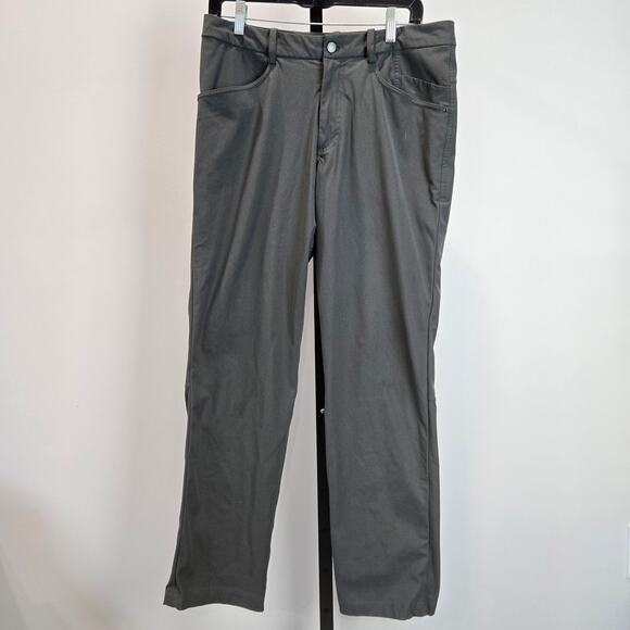 Men's Lululemon Performance chino pants in gray. More casual look with the back patch pocket style. Striped detail inside in case you wanted to roll them. These are either from the Commission or ABC line. Size 32 x 30. Great condition!