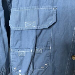 Men’s Magellan’s Outdoors button-down, short sleeve fishing shirt. This blue fishing shirt has many pockets and also has a back flap for air. Size 2 XL.