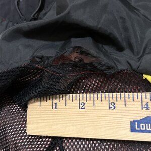 Small tear on inside lining at seam of hood and mesh lining at collar. See pictures for details.