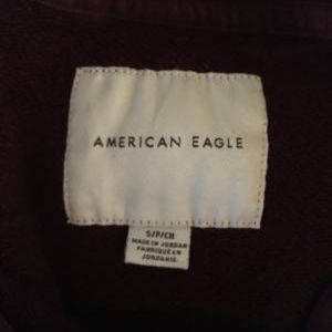 Maroon sweatshirt with American Eagle logo written across the front. Drawstring hoodie.
