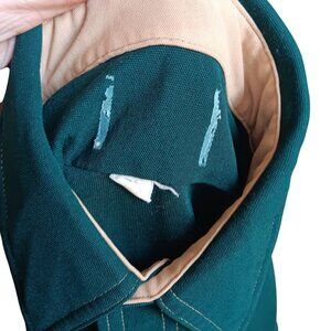 Classic style shirt with button closure and twin chest pockets. The green fabric contrasts with a beige inner collar lining for unique detailing.