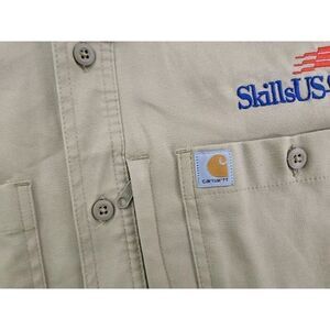 This Carhartt button-up shirt is perfect for any occasion, whether it's for work or casual wear. The shirt features a collared neckline and short sleeves, with a relaxed fit for comfort. It's made from a blend of polyester, spandex, and cotton, making it lightweight and breathable for all seasons. The shirt also has various features such as buttons, pockets, and embroidered logo accents.