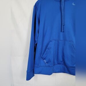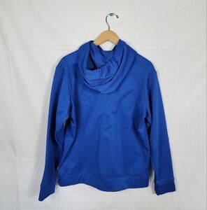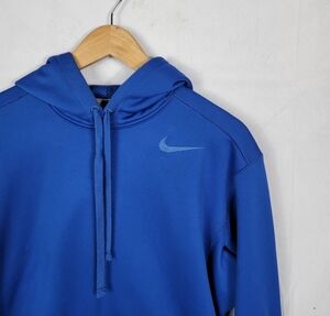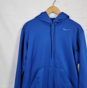 Vibrant blue Nike pullover with a drawstring hood. Features a front pocket and iconic logo.
