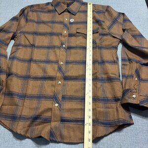 This medium-sized plaid button-up shirt features a classic brown and blue pattern, exuding timeless style. Crafted from a blend of cotton and polyester, it is designed to offer a comfortable fit and durability. Ideal for casual settings or layering, its versatile style complements various outfits.