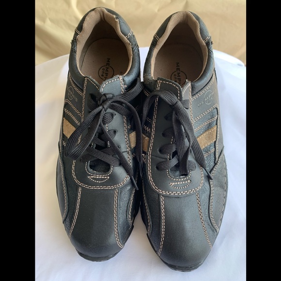 Memphis One black and tan Shoes. Black shoe strings. Right shoe: wear on edge at ankle.
