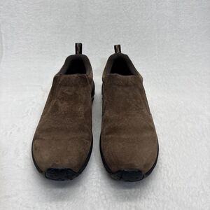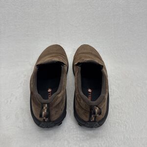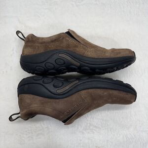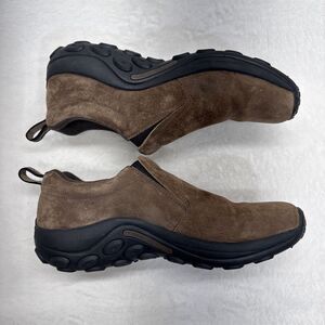 This is a pair of pre-owned Merrell Jungle Moc shoes, model J65685, in size 9.5. The shoes are in dark earth color and are regular size. Please note these are used, in very good condition.